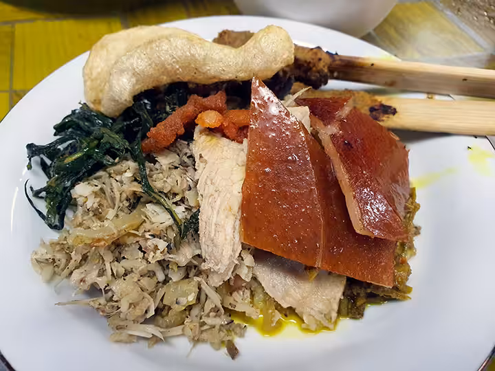 Semakin nikmat lagi bila Anda tambahkan dengan kerupuk kulit babi yang krispi dan gurih. Makan pun akan lebih lahap lagi dengan pelengkap yang satu ini.