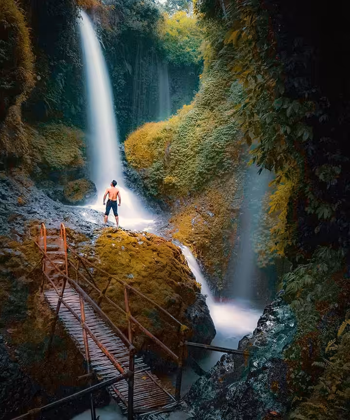 Area menuju air terjun terdapat semacam jembatan bambu sederhana. Jembatan ini kemudian menjadi spot foto yang pas di mana view air terjun akan nampak jelas saat dipotret.