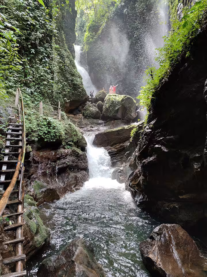 Jalurnya juga cukup curam dengan sejumlah undakan seperti tangga dari batu dan juga beberapa jembatan dari bambu. Jadi sebaiknya Anda berhati-hati dan benar-benar persiapkan kondisi fisik sebelum mengunjungi tempat ini.
