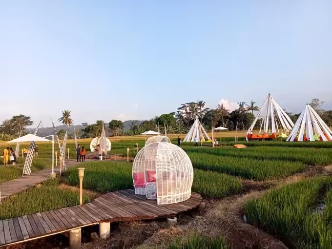 Meski hanya berupa area kecil di persawahan, tempat wisata ini mampu mencuri hati para pengunjungnya. Keseluruhan spot di tempat wisata ini dihiasi dengan ornamen khas Bali.