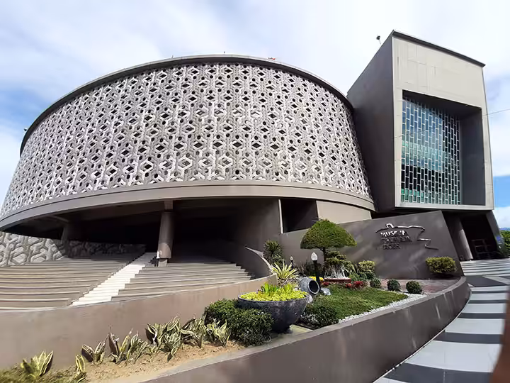Jika terlihat dari atas, bangunan museum ini tampak seperti ombak yang bergulung. Lalu bagian luarnya menyerupai anyaman bambu yang berlubang dan terlihat sangat instagramable.