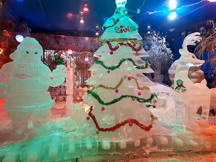 Patung-patung es ini bisa jadi spot foto yang instagramable. Apalagi, ada lampu warna-warni yang melatari area es balok ini. Pantulan warnanya membuat balok-balok es tersebut jadi terlihat berpendar.