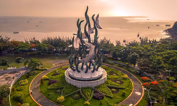 Tepat sekali, ikon Kota Surabaya yang dimaksud adalah patung Suro dan Boyo. Dalam Bahasa Indonesia, Suro berarti hiu, sedan Boyo adalah buaya. Keduanya terlihat seolah sedang bertarung.